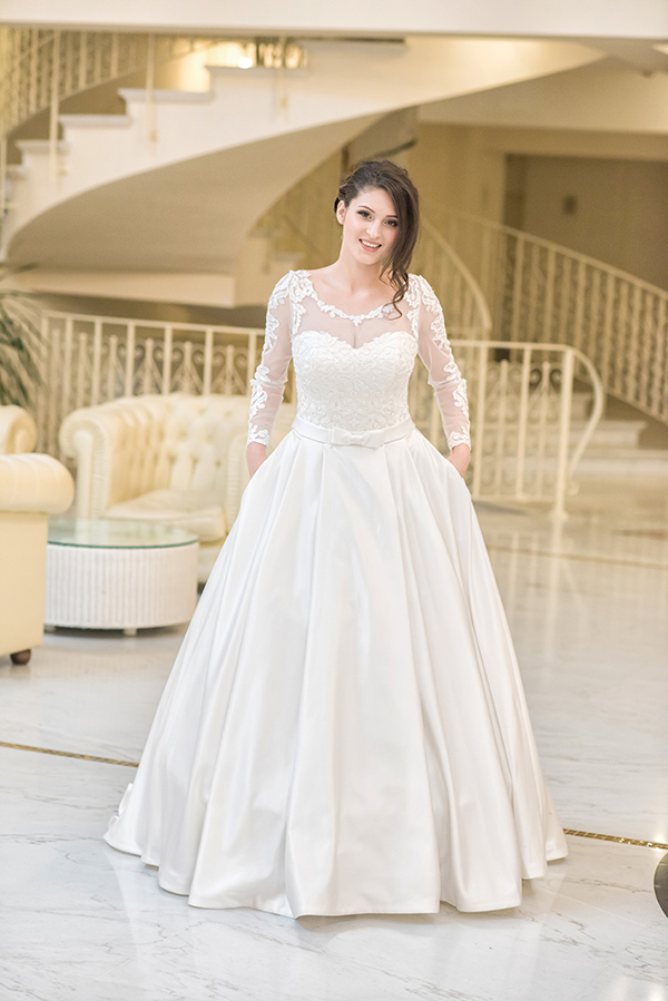 Rochia de mireasa Amely este o rochie stil printesa nu foarte voluminoasa. Ceea ce o deosebeste de alte rochii este faptul ca are buzunare. Corsetul este scurt si decupat in forma de inimioara la piept. Fundita de tafta subliniaza linia taliei. Dantela care orneaza corsetul si manecile ofera un plus de eleganta. Materiale folosite: atlas, dantela; captuseala: bumbac si poliester. Nuante disponibile: alb si ivoire.
