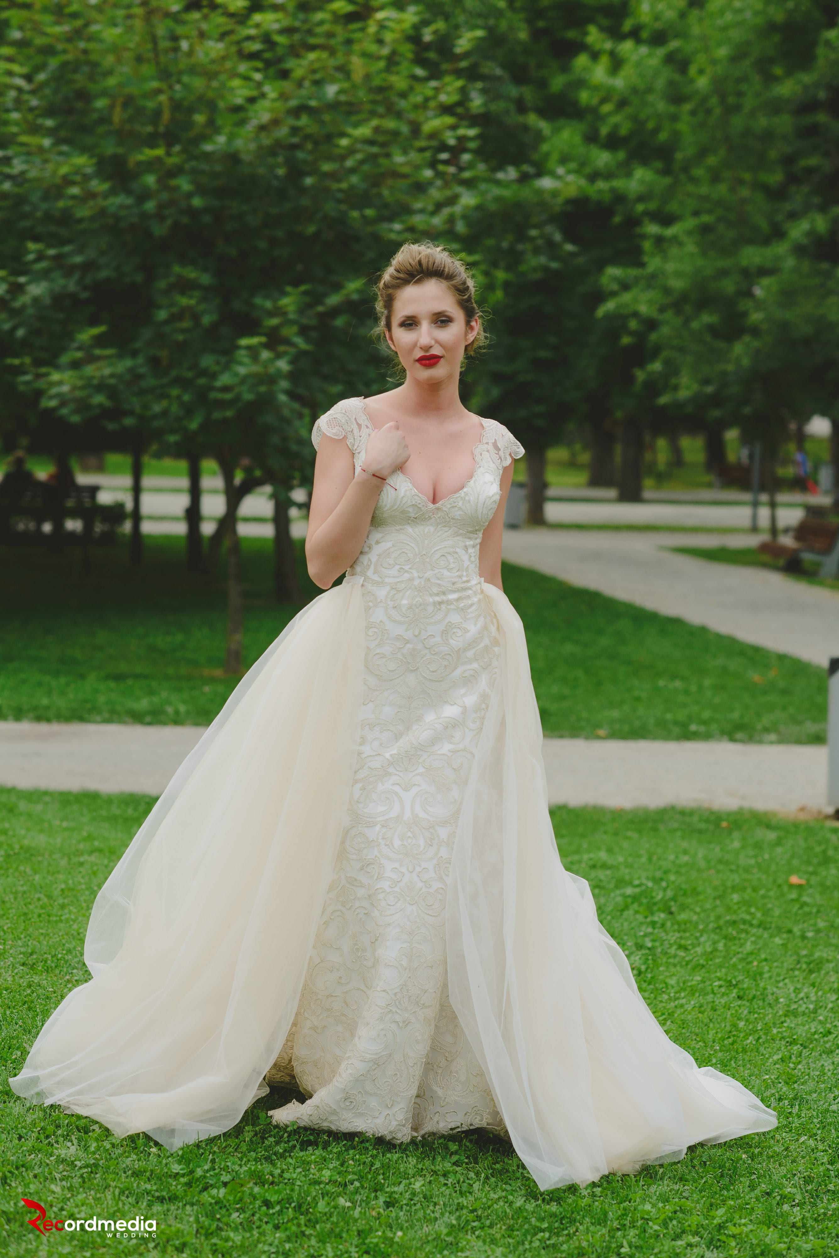 Rochia de mireeasa Elizabeth este o creatie unica, cu un aer baroc, care aminteste de evenimentele din vremurile apuse. Este o rochie cu un aspect regal, o sirena 2in 1. Trena din tulle de printesa in nuanta ivory este aplicata deasupra, si ofera voluminozitate rochiei.