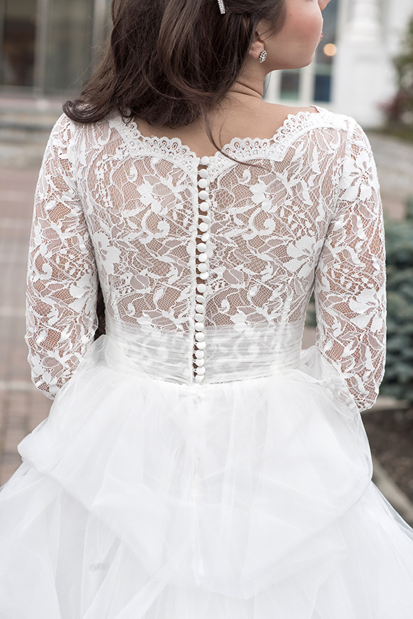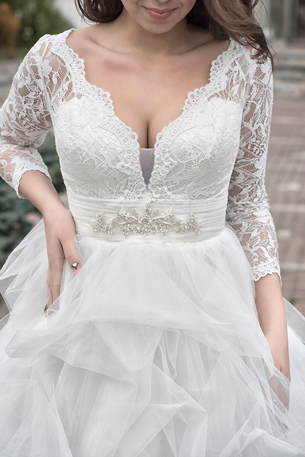 Rochia de mireasa Florina este o rochie de mireasa voluminoasa, stil printesa. Decolteul adanc, in V, pune in valoare bustul, iar dantela fina care imbraca mainile si spatele, nasturii imbracati si medalionul din talie ofera un aer elegant. Materiale folosite: tulle, tafta, dantela; captuseala: bumbac si poliester.