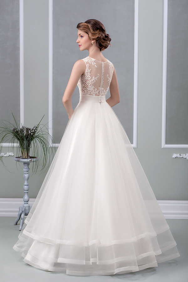 Rochia de mireasa Gloria este o rochie stil princess cu corset transparent brau lat cu elemente swarovski si poala dinalizata cu o banda care-i confera o tinuta aparte. Materiale: tulle, tafta, dantela,; culori alb, ivoire, ;,captuseala : bumbac, poliester. ; stil princess.