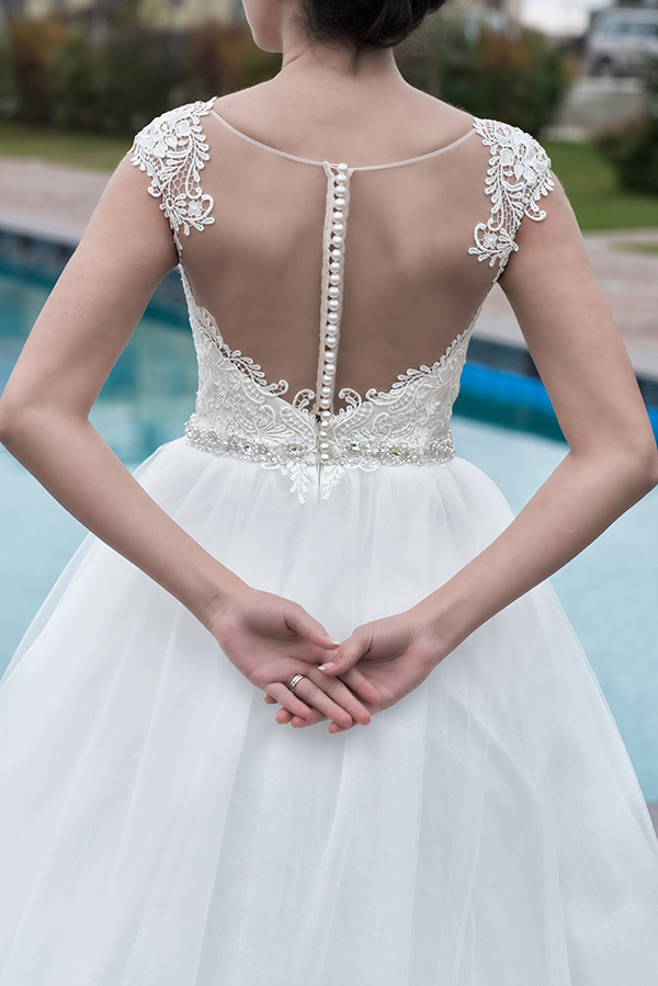 Rochia de mireasa Medea este o rochie stil printesa cu corset scurt, decoltat in forma de inimioara. Rochia este sustinuta de bretele din tulle cu aplicatii fine din dantela. Corsetul este frumos conturat de dantela fina, iar la spate se incheie cu fermoar ascuns si nasturi. Linia taliei este conturata de braul ingust lucrat manual cu elemente pretioase. Materiale folosite: tulle, dantela, tafta; captuseala: bumbac si poliester. Nuante disponibile: alb si ivoire.