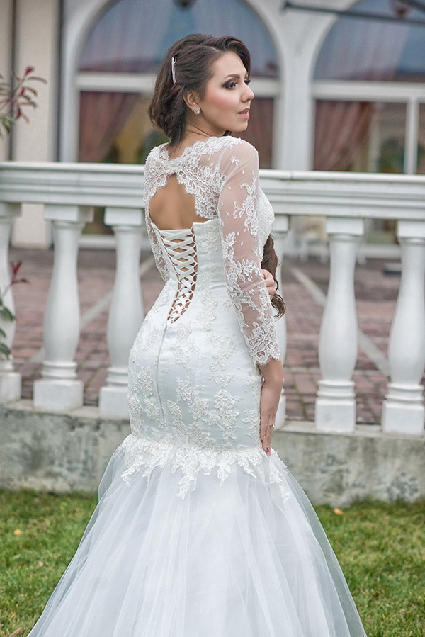 Rochia de mireasa Noemi este o rochie stil sirena cu aplicatii pretioase din dantela si poala voluminoasa din tulle. Rochia poate urma usor forma siluetei deoarece se incheie la spate cu snur. Accesoriul de sub bust este lucrat manual cu elemente swarovski. Materiale folosite: dantela, tulle, tafta; captuseala: bumbac si poliester. Nuante disponibile: alb si ivoire.