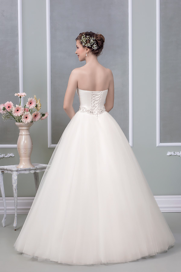 Rochia de mireasa Olivia este o rochie stil printesa cu decolteu in forma de inimioara. Corsetul este acoperit cu drapaje fine potrivite pentru o rochie delicata. Talia este evidentiata de braul lucrat manual cu elemente swarovski . Materiale folosite: tulle, tafta; captuseala: bumbac si poliester. Nuante disponibile: alb si ivoire.