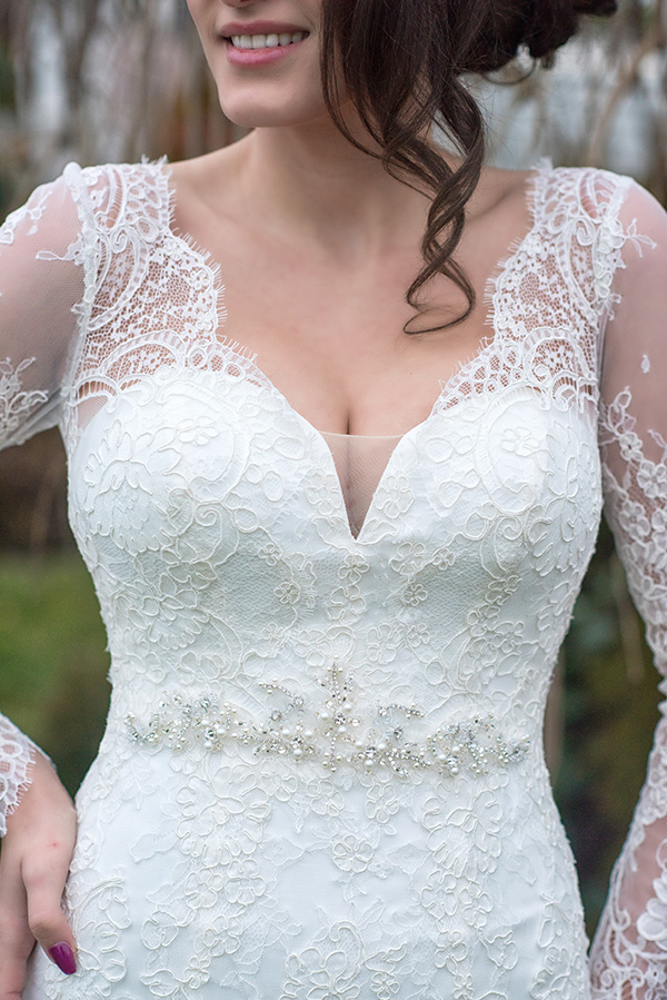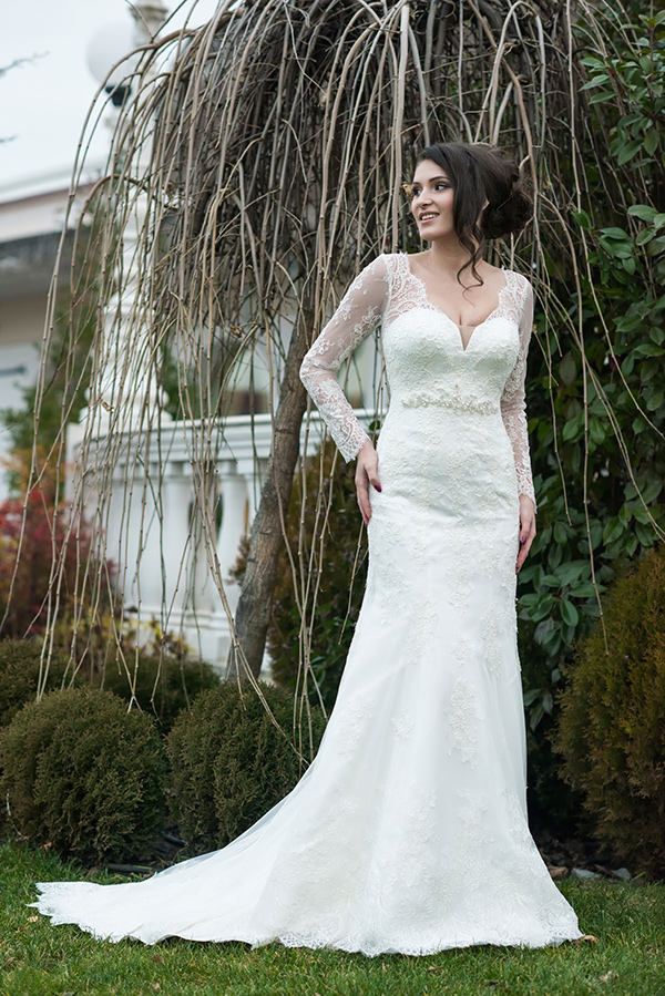 Rochia de mireasa Sorina este o rochie stil sirena cu trena lunga, regala, potrivita pentru miresele cu forme bine definite. Dantela fin lucrata si manecile lungi ofera eleganta si rafinament. Talia este evidentiata de accesoriul deosebit lucrat cu elemente swarovski. Materiale folosite: dantela, tulle, tafta; captuseala: bumbac si poliester. Nuante disponibile: alb si ivoire.