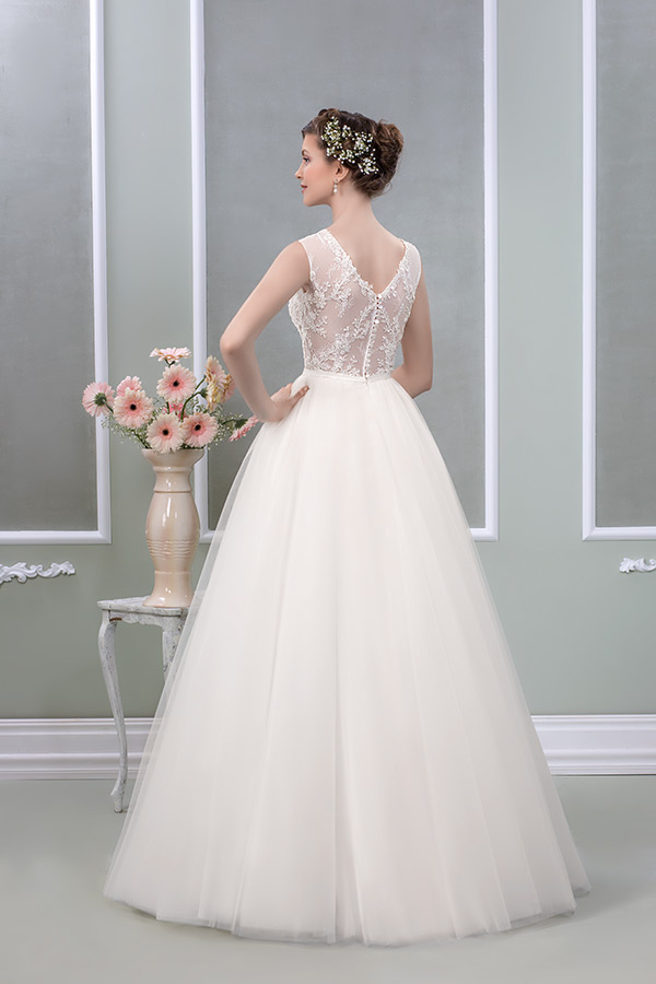 Rochia de mireasa Victoria este o rochie tip printesa cu top transparent realizat din dantela pretioasa aplicata manual pe tulle si care se incheie la spate cu nasturi. Materiale folosite: dantela, tulle, tafta; captuseala: bumbac si poliester. Nuante disponibile: alb si ivoire.